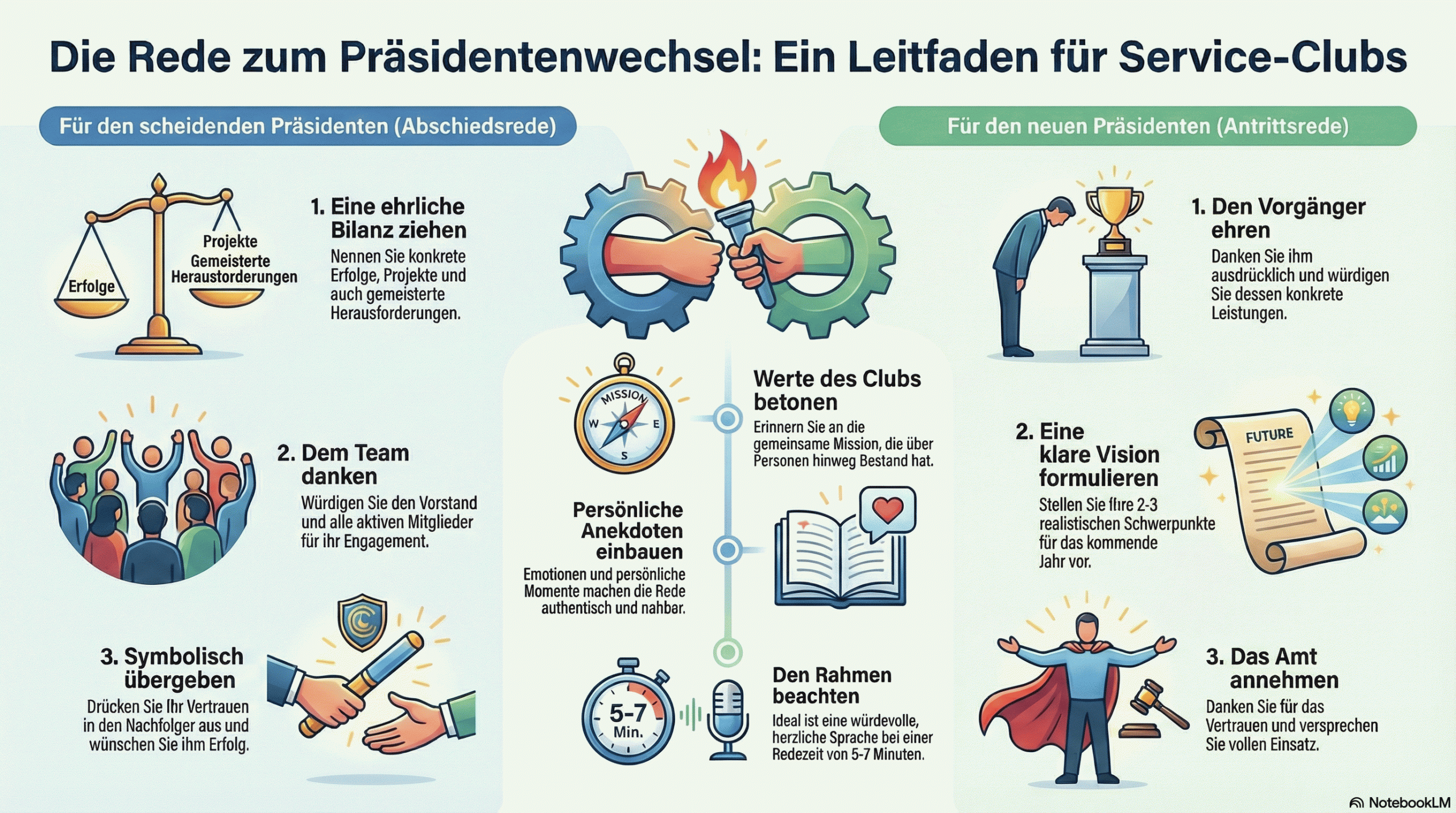 Dieser Ratgeber hilft Ihnen, eine ansprechende und motivierende Ansprache zu formulieren, welche die Bedeutung dieses Amtswechsels unterstreicht und alle Clubmitglieder, Ehrengäste und Partner einbindet.